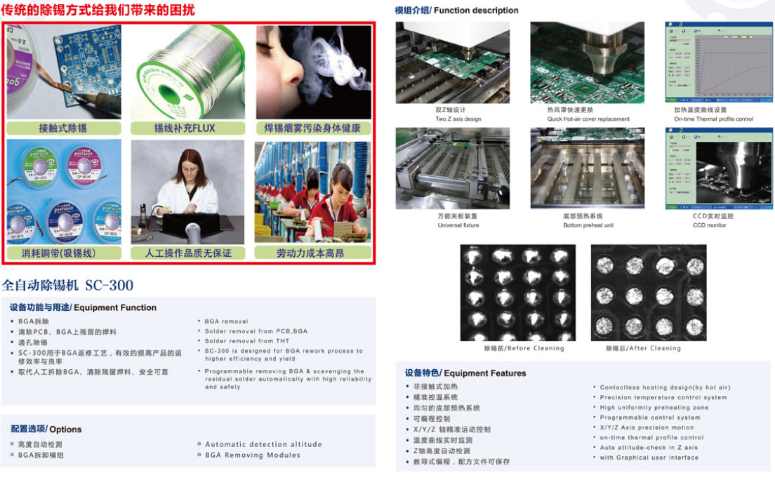 + SONIC SC-300/SC-650 非接觸式除錫機是一款主要用于BGA返修時清除殘留焊料的小型設備。有效的避免了BGA返修時人為因素的影響,同時也降低了對于返修人員的技術要求。在提高返修效率的同時亦保證了返修良率;