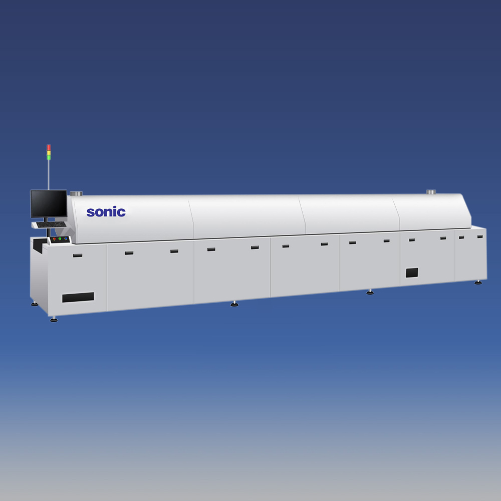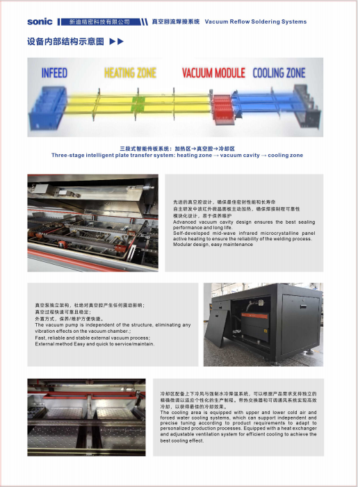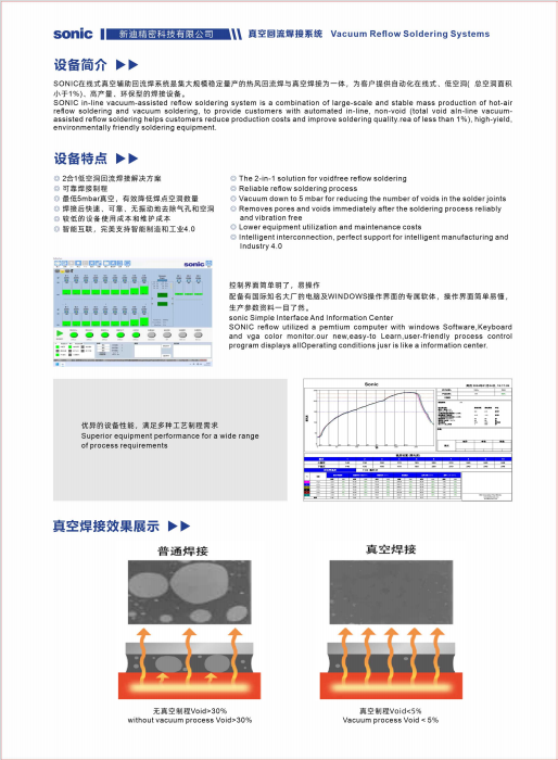 產品說明:SONIC在線式真空輔助回流焊系統是集大規模穩定量產的熱風回流焊與真空焊接為一體,為客戶提供自動化在線式、低空洞( 總空洞面積小于5%)、高產量、環保型的焊接設備。在該系統中,真空模組安裝在回流爐內,能精準調節抽真空的速度并可完成普通回流爐的溫度曲線,實現在線焊接。在線式真空輔助回流焊可幫助客戶降低生產成本、提升焊接質量。