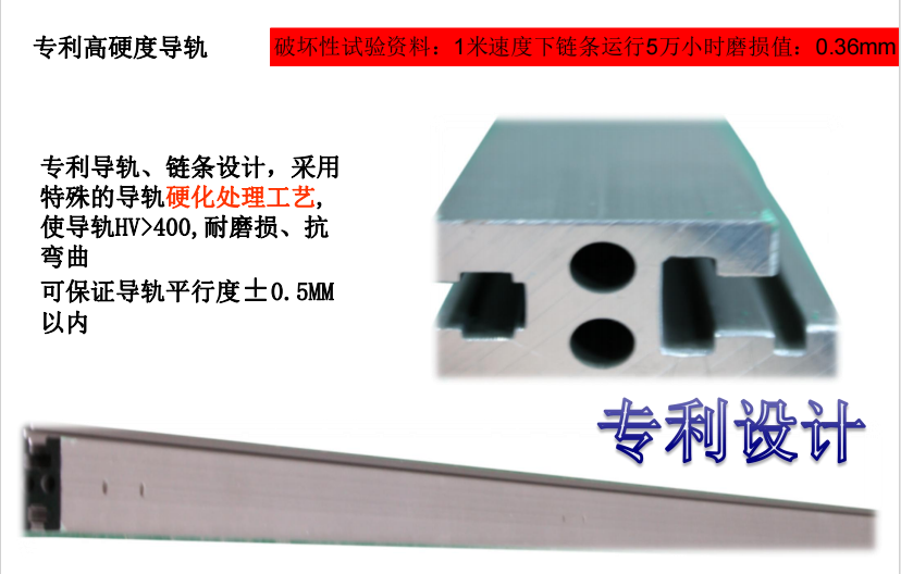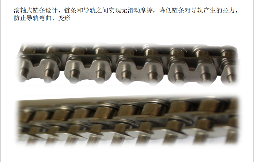 +新型鏈條運輸系統;有效避免了因軌道與鏈條間的滑動摩擦而引起的磨損、變形、塵屑、抖動等問題。